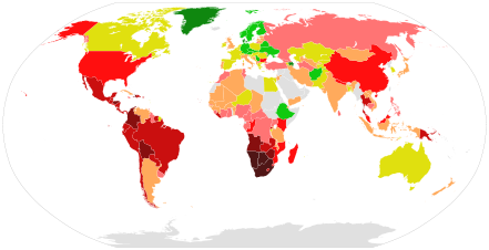 En esta imagen el color verde representa a los paises con una mejor distribución de riqueza, seguido por aquellos coloreados en amarillo y los colores naranja, rojo o marrón, representan, respectivamente, a los países con una distribución de riqueza más desigual.